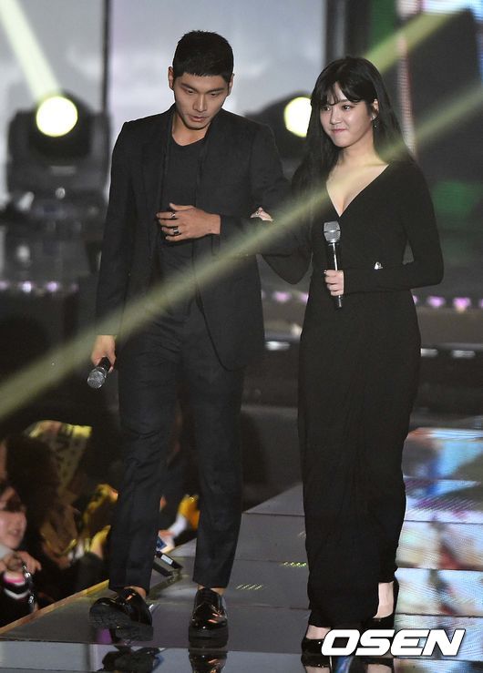 배우 이유비와 이이경이 7일 오후 서울 방이동 올림픽공원 체조경기장에서 진행된 '2015 멜론뮤직어워드'에 참석해 시상을 위해 무대로 나서고 있다.