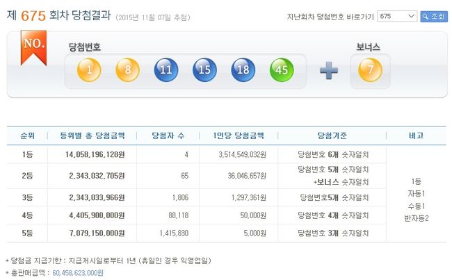 [OSEN=이슈팀] 11월 7일 저녁 추첨 된 제 675회차 로또 당첨번호가 1, 8, 11, 15 18, 45로 결정 됐다. 그리 어려운 번호로 보이지 않으나 당첨자는 전국에서 단 4명이 나왔다.