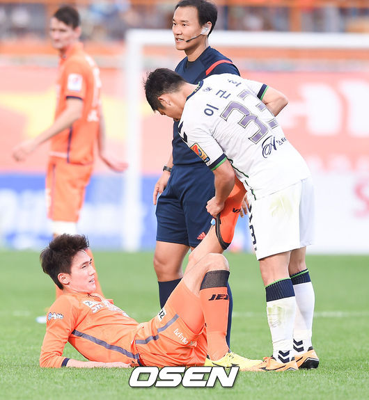 8일 오후 제주 서귀포시 제주월드컵경기장서 열린 '현대오일뱅크 K리그 클래식 2015' 제주 유나이티드와 전북 현대의 경기, 후반 전북 이근호가 제주 오반석의 햄스트링에 응급조치를 취하고 있다.