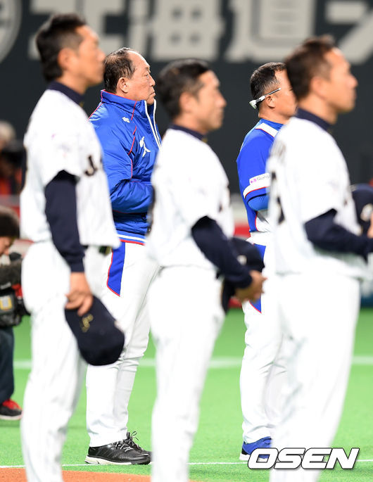8일 오후 일본 훗카이도 삿포로돔에서 열린 대한민국과 일본의 프리미어12 1라운드 B조 개막전, 경기에 앞서 대표팀 김인식 감독이 국민의례를 하고 있다.