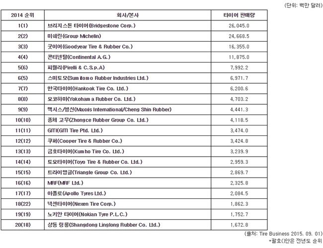 타이어 비즈니스지에 따르면 2014년 글로벌 상위 10개 타이어 기업의 매출이 전세계 타이어 매출의 약 63%에 달하는 것으로 조사됐다. 2013년과 비교해 변동이 없었다. 또한 절반 이상의 타이어 기업들이 2014년에 전세계적으로 매출이 부진했다고 보고했다고 밝혔다. 이에 따라 전세계 타이어 매출은 전년대비 약 3.5퍼센트 가량 하락해 1,800억 달러 규모에 미치지 못했다. 매출하락은 주요 통화대비 달러화 강세의 영향도 있었을 것으로 타이어 비즈니스지는 분석했다.