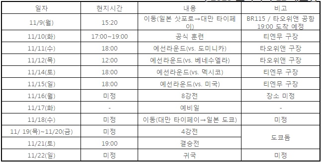 대표팀은 10일 오후 5시부터 7시까지 티엔무 구장에서 공식 훈련을 진행하며 다음날인 11일 오후 6시 타오위앤 구장에서 도미니카공화국, 12일 정오 같은 구장에서는 베네수엘라와 각각 예선 라운드를 치른다. 14~15일 오후 6시에는 티엔무 구장에서 각각 멕시코, 미국과의 경기가 열리며 16일에는 8강전이 거행될 예정이다.