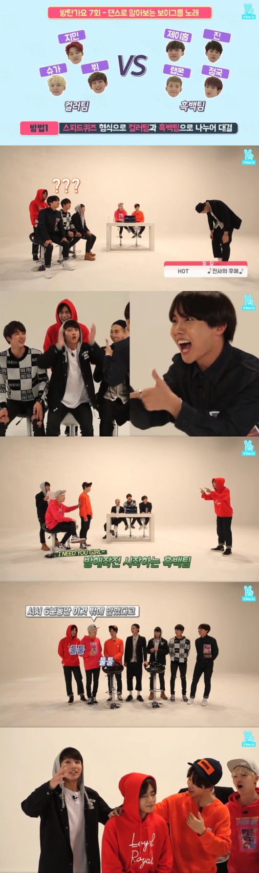 방탄소년단은 10일 오후 네이버 V앱을 통해 방송된 '방탄가요-track7'에서는 댄스로 알아보는 보이그룹 노래를 주제로 팀을 나눠서 벌칙을 걸고 몸으로만 가수와 노래 제목을 설명하는 대결을 펼쳤다.