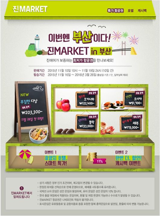 진에어의 부산~다낭, 부산~오키나와 정기 노선 취항을 기념해 진행하는 진에어의 부산발 진마켓은 오는 16일부터 2016년 3월 26일 사이(단, 부산~다낭, 부산~오키나와 노선은 11월 26일 취항 이후) 운항하는 부산~오사카, 부산~세부 등 부산발 국제선 5개 노선 항공편을 대상으로 한다.