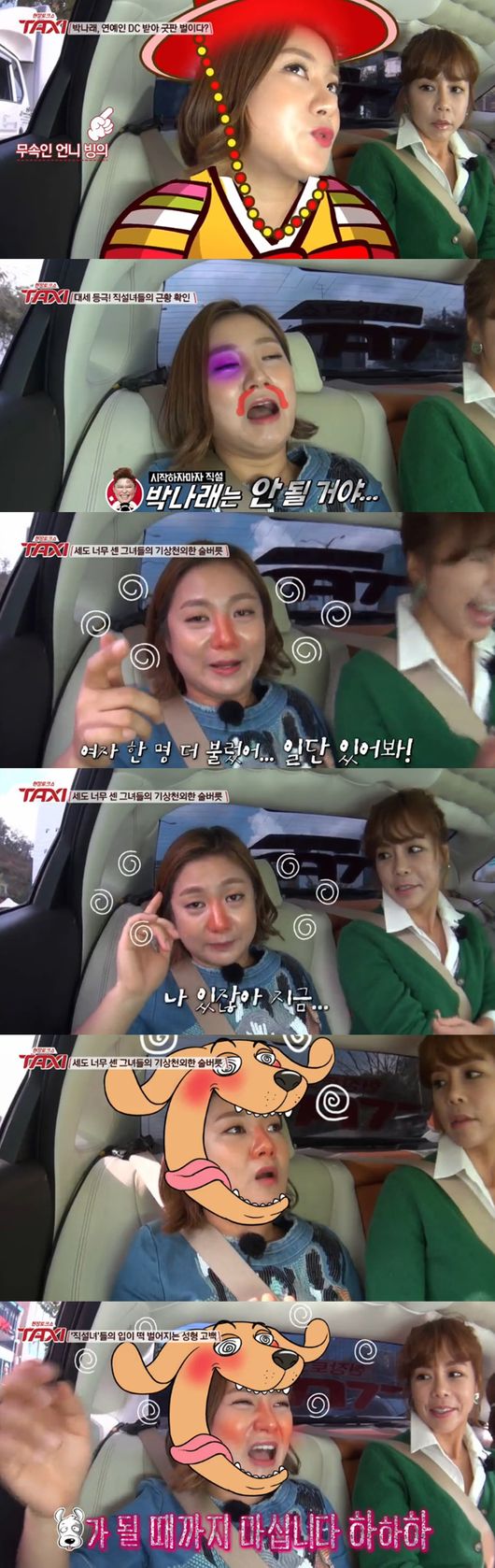 박나래는 지난 10일 방송된 tvN 예능 ‘현장 토크쇼-택시’(이하 택시) 용감한 직설녀 특집에 가수 솔비, 배우 신이와 함께 출연했다. 그는 등장부터 남달랐다. MC들에게 “작은데 세다”는 반응을 얻으며 ‘센캐’(센 캐릭터)다운 에너지를 과시했다.