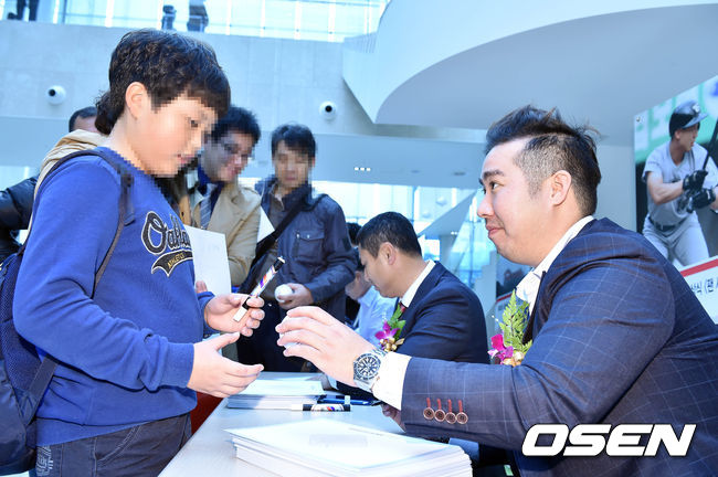시상식 전에 수상자 유희관이 사인을 하고 있다.