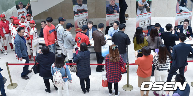 유희관 선수의 사인을 받기 위해 많은 사람들이 줄을 서고 있다.