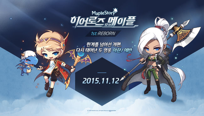 ㈜넥슨은 11일 자사의 온라인게임 ‘메이플스토리’의 2015년 대규모 겨울 업데이트 ‘히어로즈 오브 메이플’ 중 첫 번째 업데이트 ‘REBORN’을 통해 아란과 에반 캐릭터를 개편했다. 또한 티저 영상을 통해 두 번째 블록버스터 ‘히어로즈 오브 메이플’을 예고했다.