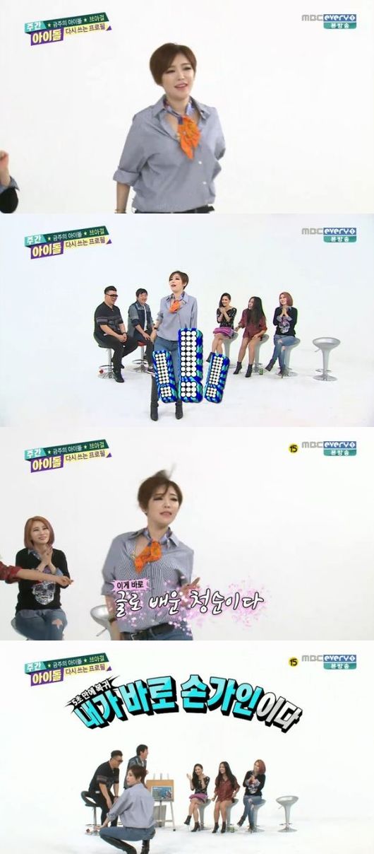가인은 11일 오후 방송된 MBC에브리원 '주간아이돌'에서 귀여운 매력을 어필한 언니들에 이어 걸그룹의 노래에 맞춰 귀여움을 발산하려고 했다.