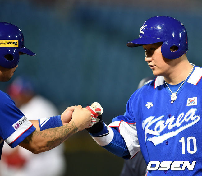 11일 오후 대만 타오위안 야구장에서 열린 '2015 WBSC 프리미어 12 ' 대한민국과 도미니카공화국의 B조 예선 2차전 경기, 8회초 1사 1루에서 대표팀 이대호가 1타점 적시타를 날리고 오재원과 교체되고 있다.