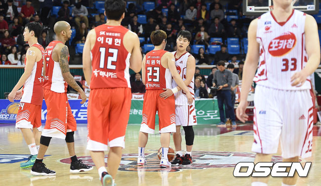 12일 오후 서울 잠실학생체육관에서 열린 '2015-2016 KCC 프로농구' 서울 SK와 고양 오리온스의 경기 종료 후 선수들이 인사를 나누고 있다.