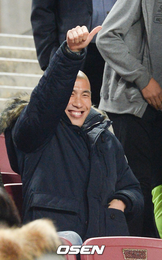 12일 오후 수원월드컵경기장에서 열린 2018 러시아 월드컵 아시아지역 2차예선 한국과 미얀마의 경기에 앞서 차두리가 슈틸리케 감독 향해 손가락을 보이고 있다.