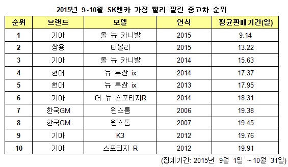 - SK엔카 조사, 연말 연식변경 앞두고 가장 빨리 팔린 중고차는?