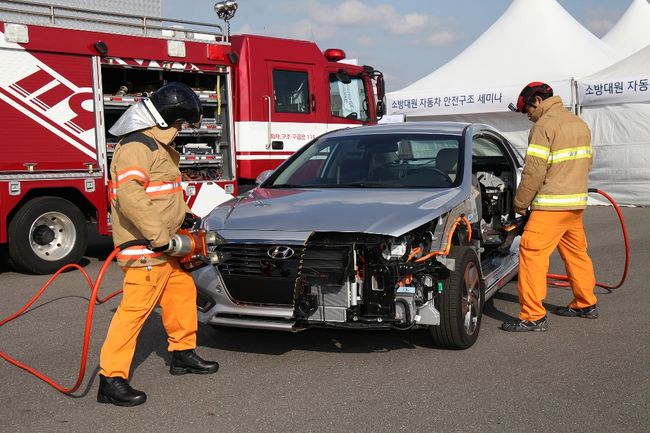 현대차가 하이브리드 등 친환경 차량으로 소방대원들의 안전구조 세미나를 열었다.