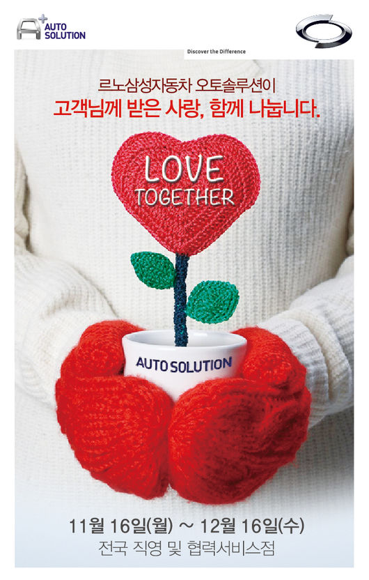 르노삼성자동차 오토솔루션은 '오토솔루션 러브 투게더 겨울 이벤트'를 통해 소비자에게 혜택을 제공하고, 동시에 어려운 이웃을 위해 수익의 일부를 나눔으로써 보다 따뜻한 연말 만들기에 동참한다.