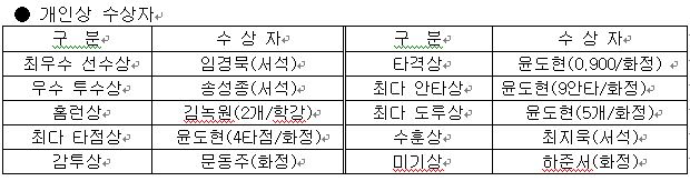 지난 9일부터 광주, 전남 지역 13개 초등학교가 참가, 토너먼트 방식으로 승부를 펼친 이번 대회에서 우승팀인 서석초에게는 우승기와 더불어 우승 트로피, 상장, 야구용품이 부상으로 주어졌다.