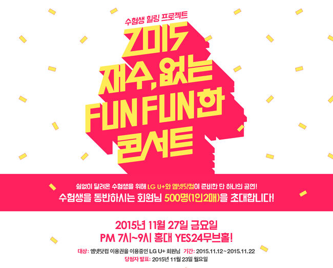 LG유플러스(부회장 이상철, www.uplus.co.kr)는 CJ E&M과 공동으로 대학수학능력시험 준비로 지친 수험생을 위해 '2015 재수(再修)없는 FunFun한 콘서트'를 오는 27일 홍대 예스24무브홀에서 개최한다고 16일 밝혔다.
