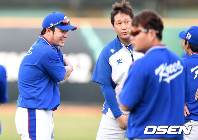 16일 오후 대만 타이중 인터컨티넨탈 야구장에서 열릴 '2015 WBSC 프리미어 12 ' 대한민국과 쿠바의 8강 경기에 앞서 대표팀 박병호가 동료들과 이야기를 나누고 있다.