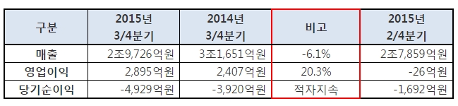대한항공에 따르면 3분기는 메르스 여파의 지속에 따라 매출이 전년 동기 대비 6.1% 하락했다. 그럼에도 불구하고 장거리 수요호조, 유류비 등 비용절감 및 효율성 확보 노력에 따라 영업이익은 전년 동기 대비 20.3% 증가, 2895억 원을 기록했다. 반면 손실폭은 전분기 1692억 원에서 4929억 원으로 대폭 증가했고 전년 동기(3920억 원)에 비해서도 크게 늘어났다.