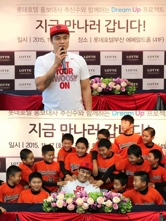 롯데호텔부산은 17일 오전 10시부터 약 2시간여 호텔 41층 에메랄드룸에서 롯데호텔 홍보대사 추신수(33, 텍사스 레인저스)와 함께 '드림 업(Dream up) 프로젝트, 지금 만나러 갑니다'를 열고, 부산시 야구 꿈나무를 대상으로 '원포인트 레슨' 등을 펼쳤다.