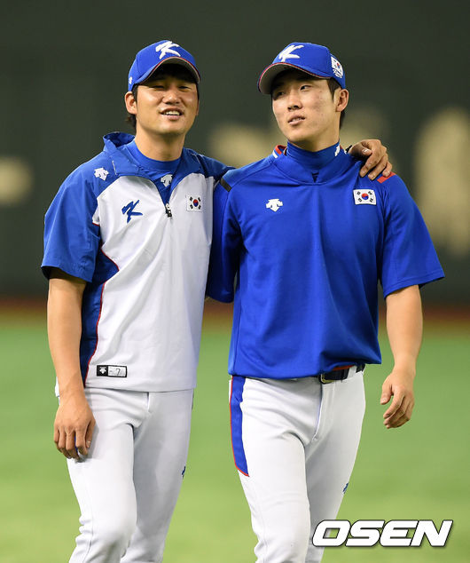 대표팀 김상수, 허경민이 외야에서 몸을 풀고 더그아웃으로 향하고 있다.