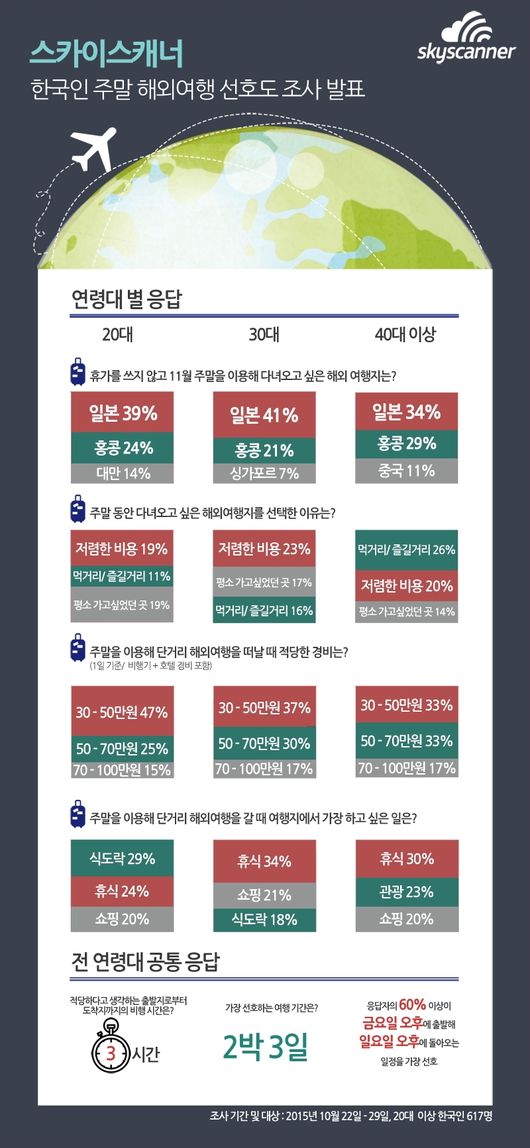 연령대와 불문하고 주말 해외여행 일정으로 소요되는 비행 시간으로는 3시간 이내를 가장 선호했고 여행 기간은 '2박 3일'이 가장 적당하다고 응답했다. 또한 전 연령대 응답자의 60% 이상이 월요일 출근, 수업 등 일상생활에 지장이 없도록 금요일 오후에 출발해 일요일 오후에 돌아오는 일정을 가장 선호한다고 밝혔다.