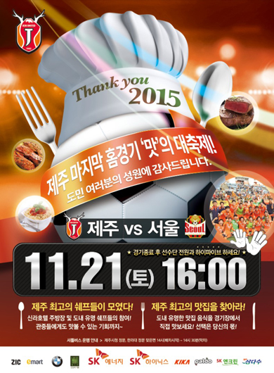 제주는 2015년 한 해 뜨거운 성원을 보내준 도민들에게 감사의 뜻을 전하기 위해 맛의 대축제 행사를 연다. 먼저 제주 최고의 쉐프들이 모였다. 신라호텔 주방장 및 도내 유명 쉐프들이 한자리에 모여 이날 경기장을 찾은 관중들에게 최고의 맛을 선사할 예정이다.