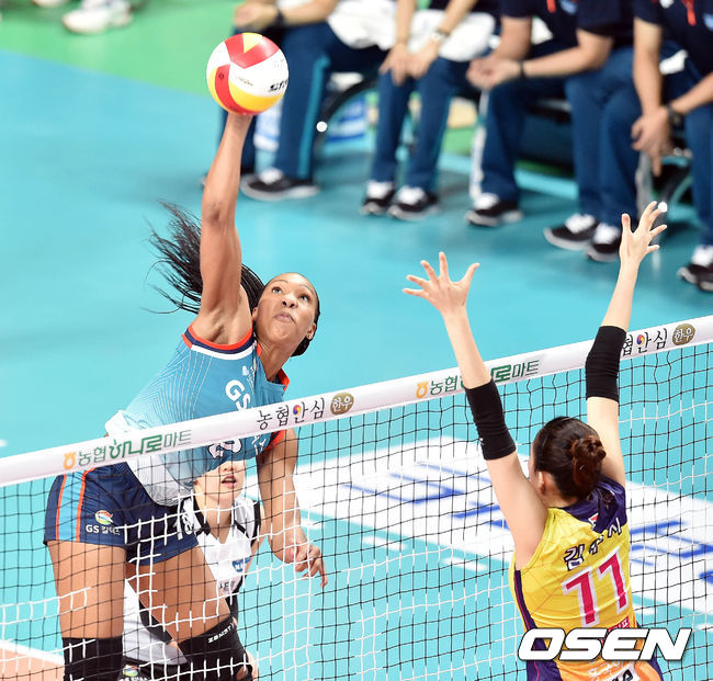 19일 오후 서울 중구 장충체육관에서 열린 '2015-2016 NH농협 V-리그' 여자부 GS칼텍스와 흥국생명의 경기 2세트 GS칼텍스 캣벨이 공격을 시도하고 있다.