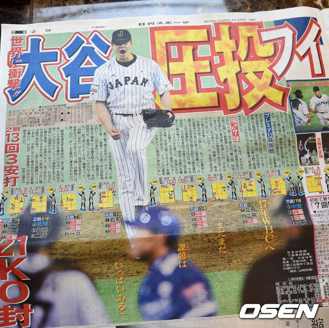 닛칸스포츠는 '실패'라는 두 글자를 신문 1면에 가장 크게 배치했고, 그 옆에 전날 기자회견장에 자리한 침통한 표정의 고쿠보 감독 모습을 사진으로 실었다. 일본 벤치의 사진도 함게 실렸는데, 교체된 오타니는 팔장을 낀 채 한국의 승리를 멍하니 바라보고 있었다. 9회초 3점의 리드를 지키지 못한 것을 굴욕이라 표현할 정도로 일본은 전날 패배를 아프게 받아들였다.