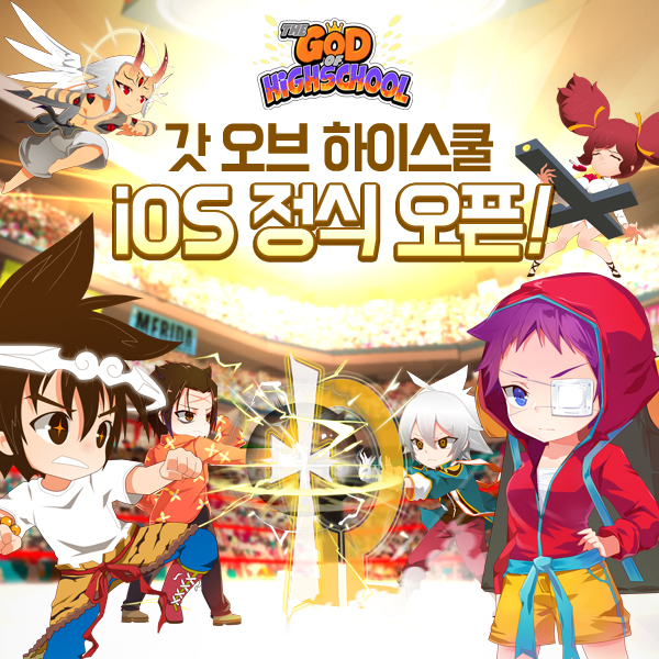 ‘갓 오브 하이스쿨’의 iOS 버전은 금일 정식 오픈 되며, 안드로이드 버전과 별개의 서버로 운영될 예정이다. 또한 iOS 이용자들은 별도의 회원가입 절차 없이 접속할 수 있으며, 페이스북 및 게임센터(iOS)로 연동이 가능하다.