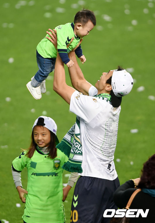 21일 오후 전라북도 전주시 전주월드컵경기장서 열린 '현대오일뱅크 K리그 클래식 2015' 전북 현대와 성남 FC의 K리그 클래식 37라운드를 마치고 열린 우승 시상식과 세레머니가 진행되고 있다. 이동국이 자신의 자녀들중 대박이(이시안) 함께 우승 세레머니를 펼치고 있다.