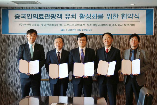 롯데호텔부산(총지배인 김성한)은 지난 20일 정오 롯데호텔부산 33층 클럽라운지에서 부산성형외과의사회, 롯데부산면세점, 그랜드코리아레저 세븐럭코리아, ㈜씨앤캐이 등 4개 기관과 '업무 제휴 협약식'을 갖고 중국인 의료관광객 유치 활성화를 위한 협력 관계 강화를 약속했다. 이날 협약식에는 롯데호텔부산 김성한 총지배인, 부산성형외과의사회 서일경 회장, 롯데부산면세점 정삼수 점장, 세븐럭코리아 김진세 본부장, ㈜씨앤캐이 김영철 대표이사 등이 참석했다.