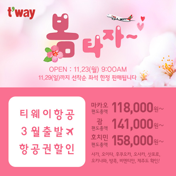 티웨이항공은 내년 3월에 출발하는 얼리버드 항공편의 특가 이벤트를 실시한다.