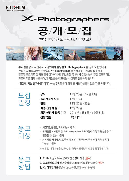 서류 발표는 12월 18일, 최종 발표는 12월 29일로 예정되어 있다. X-포토그래퍼스 모집 및 활동에 대한 자세한 내용은 후지필름 코리아 홈페이지(http://fujifilm-korea.co.kr)를 통해 확인할 수 있다.