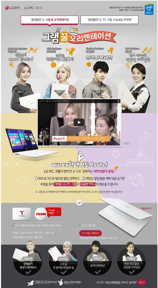 LG전자는 한 손에 감기는 초경량 노트북 ‘그램’의 특징을 앞세워 대학생활 매력남녀가 되기 위한 ‘그램 꿀 오리엔테이션’ 영상을 1인미디어 인터넷방송 형식으로 제작했다. ‘성형 없이 새내기 퀸가 되기’, ‘스무살, 첫 클러빙 NO굴욕팁’, ‘본격사복패션’, ‘번호 따고 싶은 신입생 스타일링’ 등 4가지 테마에 맞춰 나만의 매력과 미모 가꾸기를 위한 4가지 꿀팁을 MBC 예능프로그램 '마이 리틀 텔레비전'을 통해 큰 인기를 얻은 헤어 스타일리스트 차홍을 비롯해 뷰티 크리에이터 라뮤끄, 패션몰 CEO 박태준, 클럽DJ DJ소다가 참여했다.