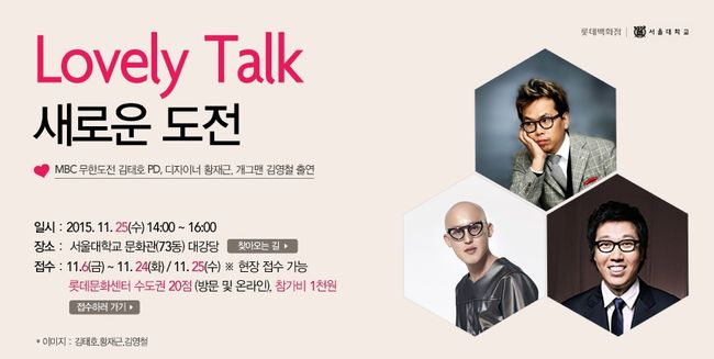 MBC-TV간판프로그램 ‘무한도전’ 스타PD 김태호, 개그맨 김영철, 디자이너 황재근 등이 오는 25일 서울대학교 문화관 대강당에서 예비대학생의 새로운 도전을 격려하는 기회를 토크쇼 형식으로 진행한다. 수도권 점포 문화센터나 온라인으로 신청 가능하며 참가비 1천원은 문화예술발전기금으로 전액 사용 예정이다.