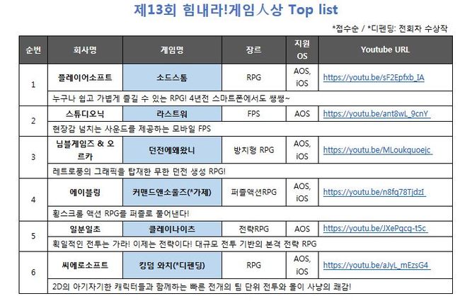 [OSEN=신연재 인턴기자] 게임인재단이 주최하는 중소 게임 개발사들을 위한 '제 13회 힘내라! 게임人상'의 탑리스트 선정작이 공개됐다.