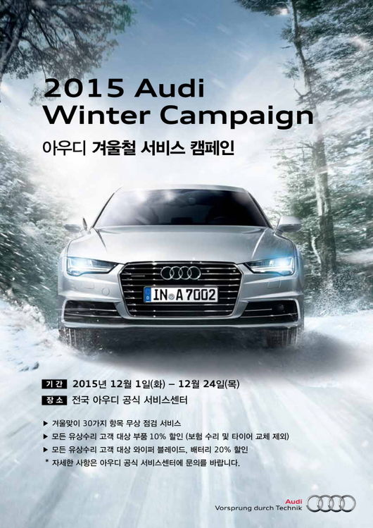 아우디 코리아는 소비자들의 안전한 겨울철 드라이빙을 위해 12월 1일부터 24일까지 전국 아우디 공식 서비스센터에서 아우디 전 차종 대상으로 ‘2015 아우디 윈터 캠페인’을 실시한다.