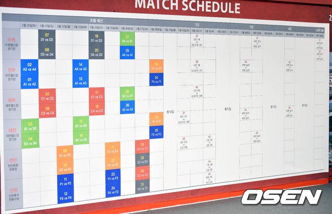 개막전은 전주에서 열린다. 대회 첫날인 5월 20일 전주에서 A조의 조별리그 2경기가 진행된다. 본부 도시로 선정된 수원에서는 6월 11일에 3-4위 결정전과 결승전이 열린다. 준결승전은 6월 8일 전주와 대전에서 열리고, 8강전은 수원과 전주, 대전과 천안에서 진행된다. /sportsher@osen.co.kr