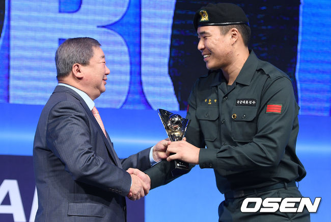 구본능 총재가 KBO 퓨처스리그 홈런상을 수상한 상무 한동민과 악수를 나누고 있다.