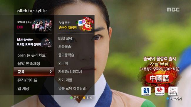 KT(회장 황창규, www.kt.com)의 IPTV 서비스 올레tv가 중국어 교육 월정액 3종을 24일 내놨다. 중국어 VoD 강좌 월정액 출시는 유료방송 업계 첫 사례다.