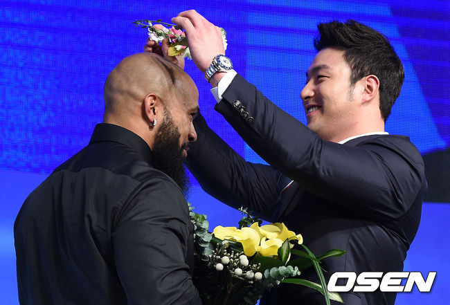 넥센 박병호가 KBO MVP를 수상한 NC 테임즈에게 화관을 선물하고 있다.