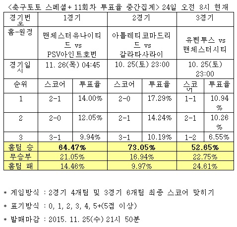 [축구토토] 체육진흥투표권 수탁사업자인 케이토토는(www.ktoto.co.kr)는 오는 26일 새벽 4시 45분에 펼쳐지는 맨체스터유나이티드-PSV아인트호번(1경기), 아틀레티코마드리드-갈라타사라이(2경기), 유벤투스-맨체스터시티(3경기)전 등 2015-2016 UEFA 챔피언스리그 조별리그 5차전 3경기를 대상으로 한 축구토토 스페셜+ 10회차 투표율 중간집계 결과, 축구팬의 64.47%가 맨체스터유나이티드-PSV아인트호번(1경기)전에서 맨체스터유나이티드(이하 맨유)의 승리를 예상했다고 밝혔다.