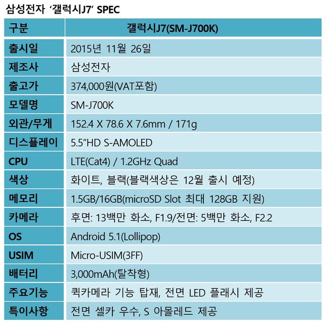 KT 디바이스 본부장 이현석 상무는 "단말기유통구조개선법 도입 이후, 중저가 모델에 대한 수요가 지속해서 증가하고 있고, 합리적인 가격과 대화면을 갖춘 실속형 단말을 원하는 고객들이 많아졌다. KT는 이러한 고객들의 의견을 종합적으로 반영하여, 이미 해외에서 검증된 '갤럭시J7'을 '단독' 출시하게 되었다"고 밝히며 "2013년 8월 출시된 '갤럭시S4미니' 이후 2년여 만에 출시되는 삼성전자 전용모델인 만큼 앞으로도 양사가 적극적으로 협력하여 KT만의 차별화된 단말로 고객에게 더욱 넓은 선택폭을 제공하겠다"고 전했다. /letmeout@osen.co.kr