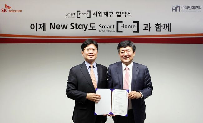 SK텔레콤(대표이사 사장 장동현, www.sktelecom.com)은 25일 HN주택임대관리(대표이사 사장 백제욱)와 내년 분양 예정인 '뉴스테이(New Stay)' 임대주택에 스마트홈 연동기기를 설치하기로 협약(MoU)을 체결했다.