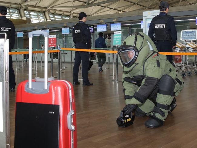 24일 인천공항 여객터미널에서 방치가방이 발생한 상황을 가정한 대응태세 훈련이 실시됐다. 인천공항 폭발물처리반이 출동하여 신속, 정확하게 폭발물을 처리하는 훈련을 하고 있다. /인천공항 제공