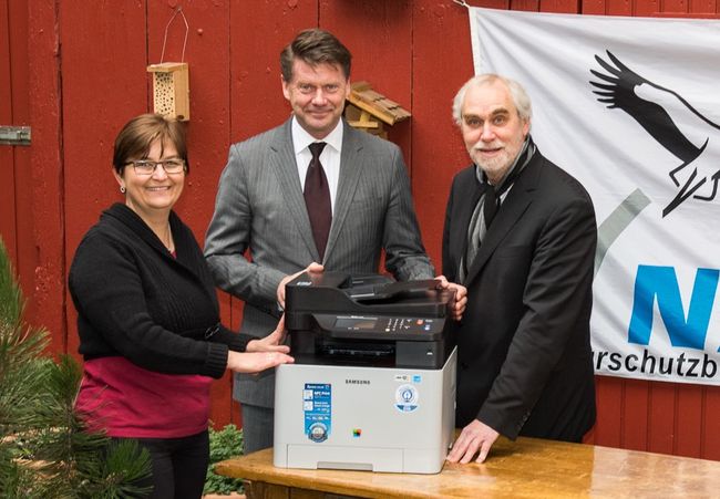 삼성전자 프린터가 독일 친환경 인증인 ‘블루엔젤(Blue Angel)’을 100번째 취득하고 이를 기념하기 위해 24일(현지시간) 독일자연보호연맹 ‘나부(NABU, Nature and Biodiversity Conservation Union)’ 본사에 A4 컬러 레이저 복합기 100대를 기부했다.