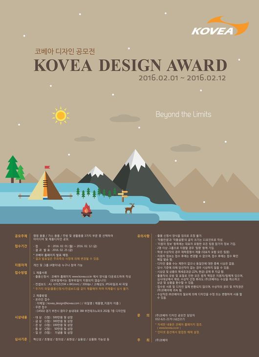 응모 작품 접수는 2016년 2월 1일부터 12일까지 진행한다. 공모 주제는 텐트, 테이블, 체어를 비롯해 가스스토브, 랜턴, 코펠 등 모든 캠핑용품이 대상이며, 출품신청서와 제품 디자인을 담은 컨셉보드를 이메일 또는 우편으로 접수하면 된다.