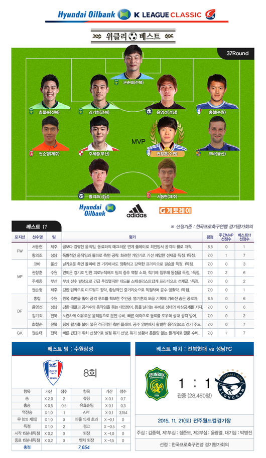 프로축구연맹은 25일 오후 클래식 37R 베스트 일레븐을 발표하며 권창훈을 최고의 별로 꼽았다. 그는 지난 22일 포항 스틸러스와 홈경기서 동점골을 넣으며 2-1 승리를 도운 바 있다.