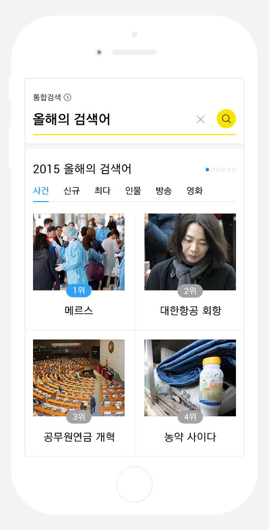 2015년 한 해 동안 이용자들에게 가장 화제가 됐던 검색어는 온 국민을 불안에 떨게 만들었던 ‘메르스’가 차지했다. 국내에 첫 확진 판정을 받은 환자가 나오고, 전국적으로 메르스가 확산됨에 따라 ‘메르스 증상’, ‘메르스 예방법’ 등 관련 정보에 대한 검색량이 크게 증가한 것으로 보인다. 그 결과 ‘메르스’는 올해의 ‘신규 검색어’와 ‘사건 검색어’ 2개 부문에서 1위를 차지했다.